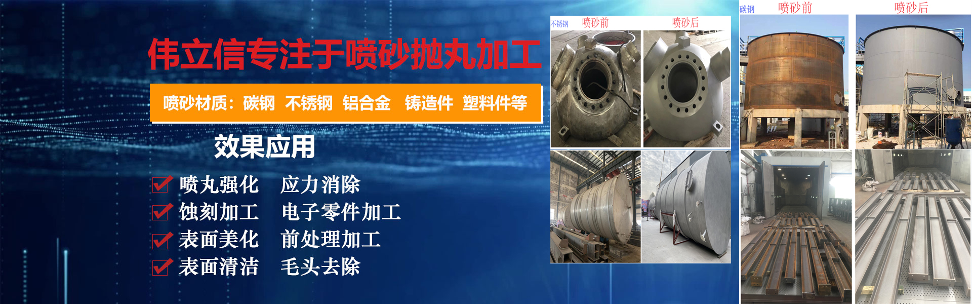 武漢偉立信機械設備有限公司(噴砂熱線(xiàn):18186495283)是一家從事表面涂裝和表面清理設備的廠(chǎng)家,公司位于武漢市武昌區。是一家集表面涂裝和表面清理設備科研、開(kāi)發(fā)、生產(chǎn)、銷(xiāo)售、服務(wù)于一體的綜合型企業(yè)。 公司自創(chuàng )建以來(lái),一直秉持認真、負責的態(tài)度,以其科學(xué)而嚴密的管理,先進(jìn)而不斷創(chuàng )新的技術(shù),致力于表面處理設備的研制和開(kāi)發(fā),主要產(chǎn)品有:手動(dòng)噴砂機、自動(dòng)噴砂機、開(kāi)放式加壓噴砂機、干濕式噴砂機及大型噴砂房,拋丸機,除塵設備,另可根據客戶(hù)要求定做。低價(jià)經(jīng)營(yíng)各類(lèi)噴砂磨料:玻璃珠、鋼砂、鋼丸、不銹鋼丸、鋼絲切丸···